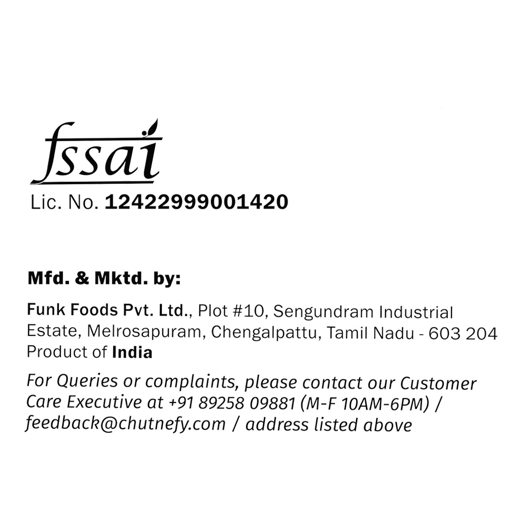 For Queries or complaints, please contact our Customer Care Executive at +91 89258 09881 (M-F 10AM-6PM) / feedback@chutnefy.com / address listed