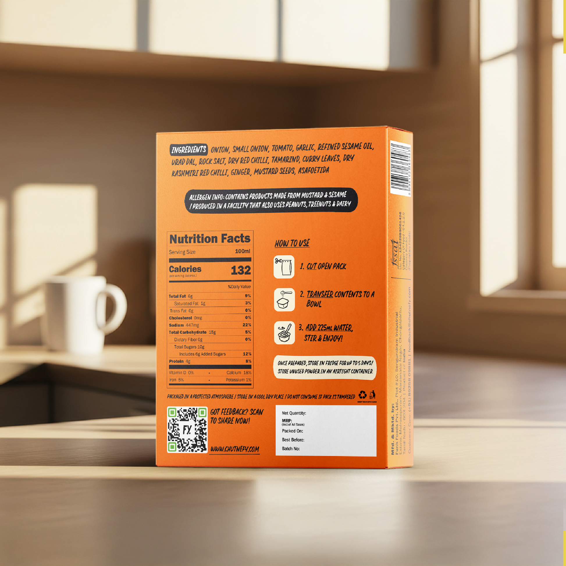Chutnefy is cooked the traditional way, then gently freeze-dried to remove moisture while retaining 100% of the flavour and up to 95% of the nutrition. Unlike wet chutneys that rely heavily on preservatives or constant refrigeration, Chutnefy stays shelf-stable as a light, dry powder. Add water, and it comes alive again, tasting just as fresh as the day it was made.