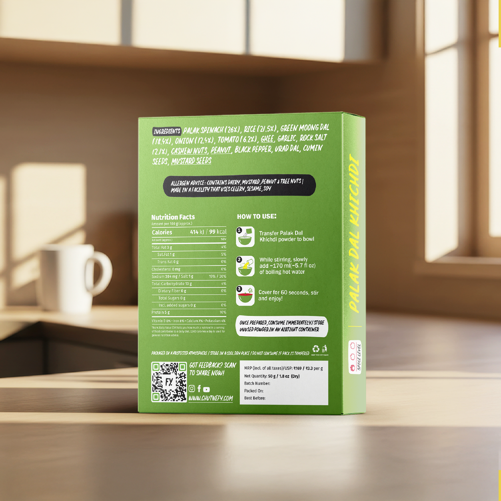 The Pongal or Khichdi is cooked the traditional way, then gently freeze-dried to remove moisture while retaining 100% of the flavour and up to 95% of the nutrition. Unlike other instant meals that rely heavily on preservatives, Chutnefy stays shelf-stable as a light, dry powder. Add hot water to the Pongal or Khichdi, and it comes alive again, tasting just as fresh as the day it was made.