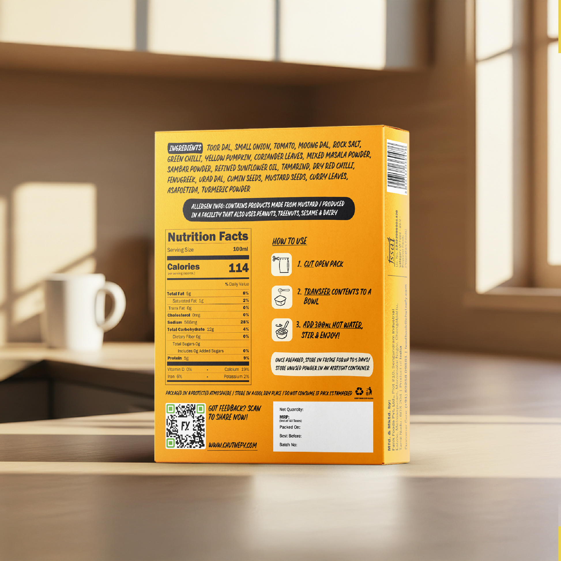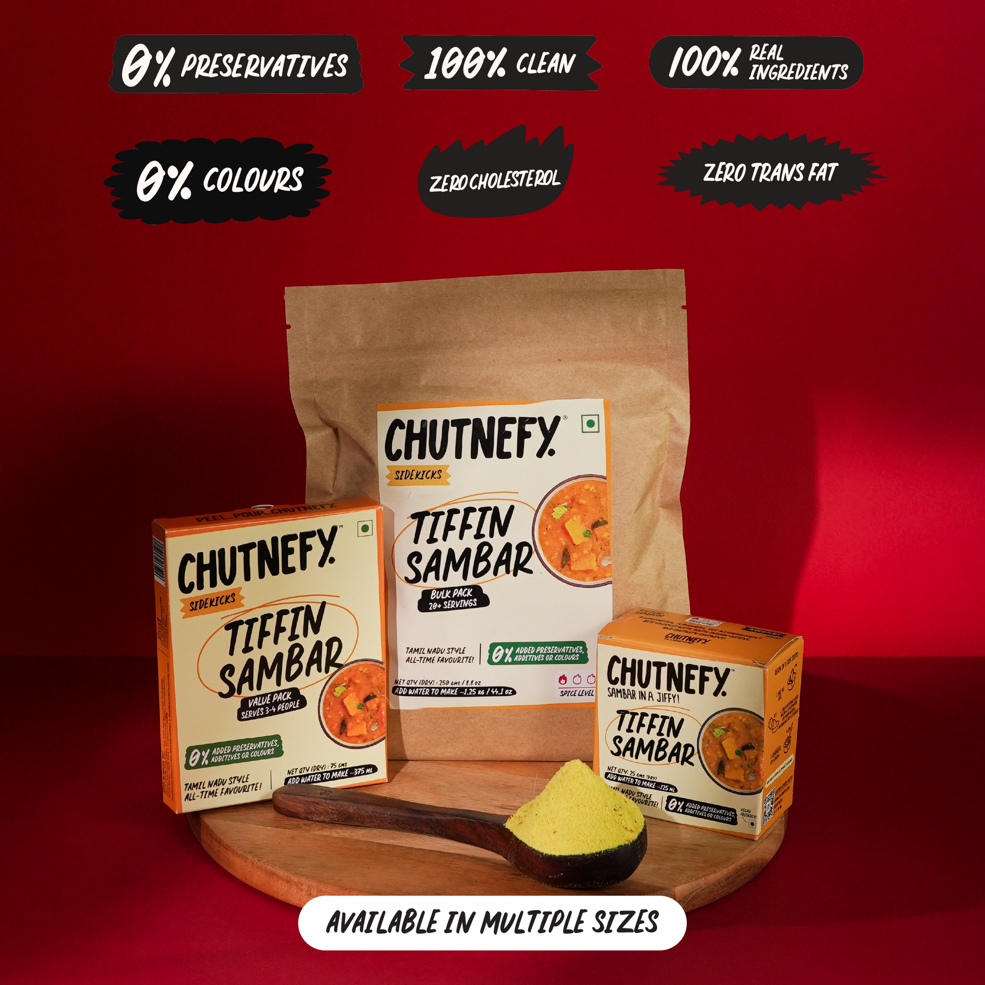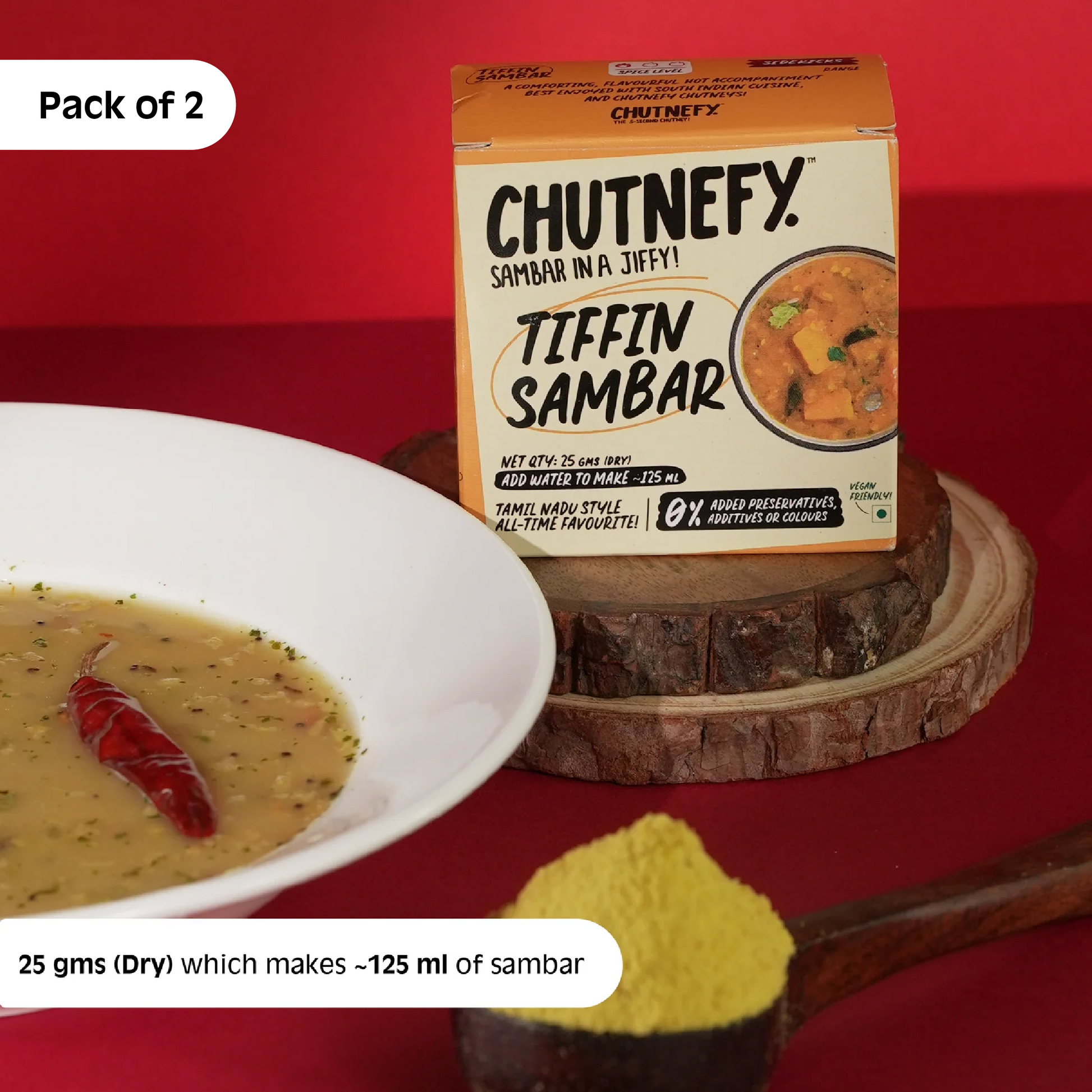 Sambar is cooked the traditional way, then gently freeze-dried to remove moisture while retaining 100% of the flavour and up to 95% of the nutrition. Unlike other instant sambars that rely heavily on preservatives, Chutnefy stays shelf-stable as a light, dry powder. Add water, and it comes alive again, tasting just as fresh as the day it was made.