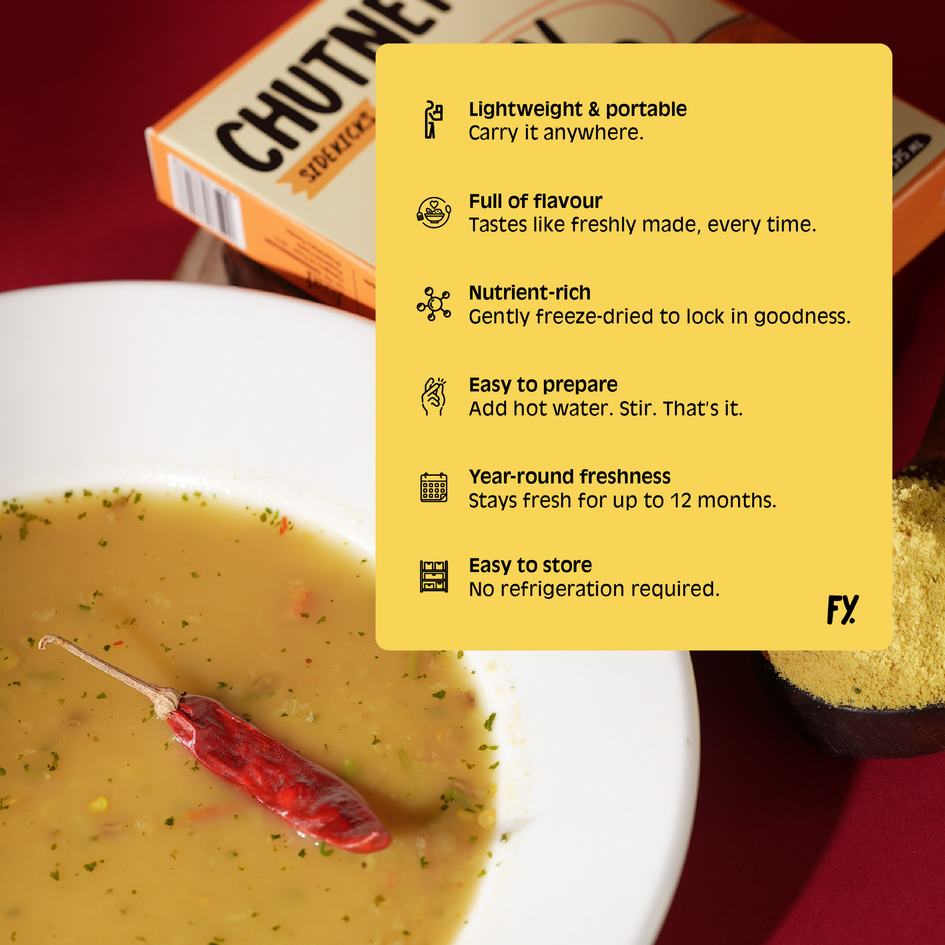 No and that’s the best part. The tempering is already built in and preserved through freeze-drying. Once you mix it, the flavour blooms exactly as intended. No extra pans, no extra oil, no finishing steps. Just chutney, done right.